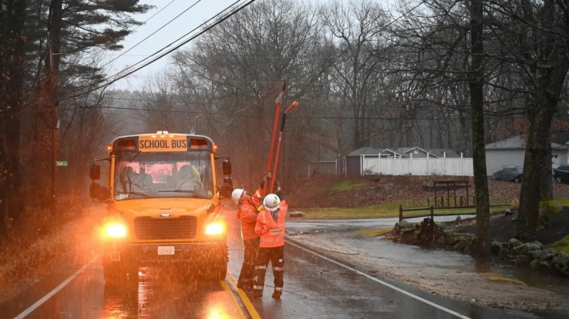 Students were late to class Monday morning in Hudson after high winds caused electrical wires to fall on a school bus.