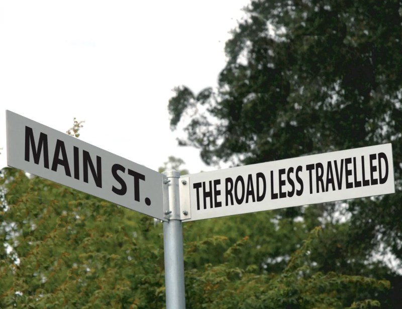 Two road signs pay tribute to poet Robert Frost's 'The Road Not Taken’. Photo by Neil Stanners/ GettyImages