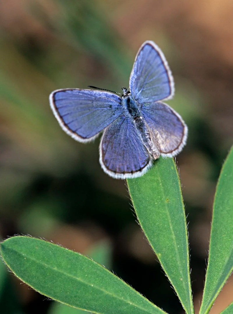 You can identify male Karner Blue butterflies by their silvery blue or dark blue wings, while females have gray-brown wings with bands of orange inside.