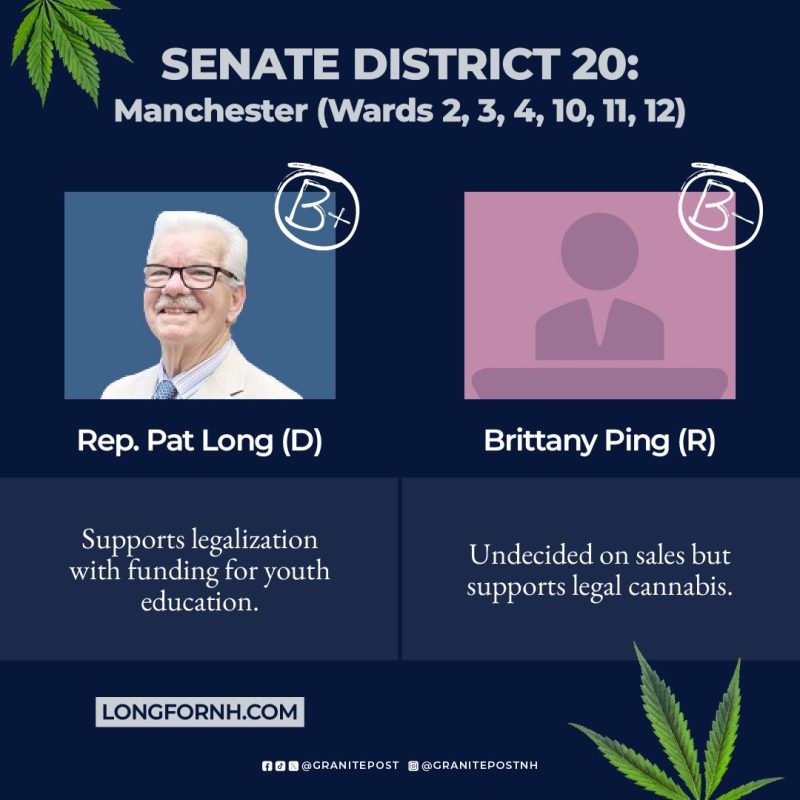 Democrat Patrick Long is facing off against Republican Brittany LeClear-Ping for the District 20 Senate seat, which serves Manchester. The seat is open as Democrat Lou D’Allesandro retired after 50 years in office.