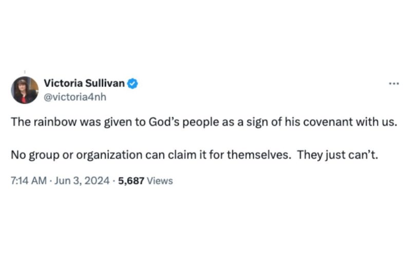 Republican candidate for New Hampshire State Senate Victoria Sullivan kicked off pride month by saying the LGBTQ+ community had no right to use the rainbow as a symbol, saying it was “given to God’s people as a sign of his covenant with us,” and that “no group or organization can claim it for themselves.”