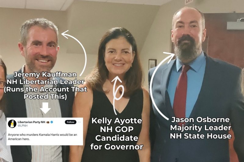 New Hampshire State House Majority Leader, Republican Jason Osborne — a high-profile member of the libertarian Free State Project — is also seen in the photograph with Ayotte and Kauffman. Osborne has not spoken against the threatening post, perhaps seeking to preserve his status among those in his caucus who stand with Kauffman.