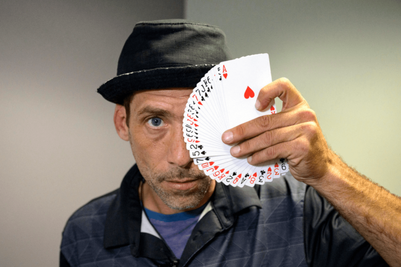 Paul Carpenter, a New Orleans magician, performs card tricks during an interview in New Orleans, Friday, Feb. 23, 2024. Carpenter says he was hired in January by Steve Kramer, who has worked on ballot access for Democratic presidential candidate Dean Phillips, to use AI software to imitate President Joe Biden's voice to convince New Hampshire Democrat voters not to vote in the state's presidential primary. (AP Photo/Matthew Hinton)
